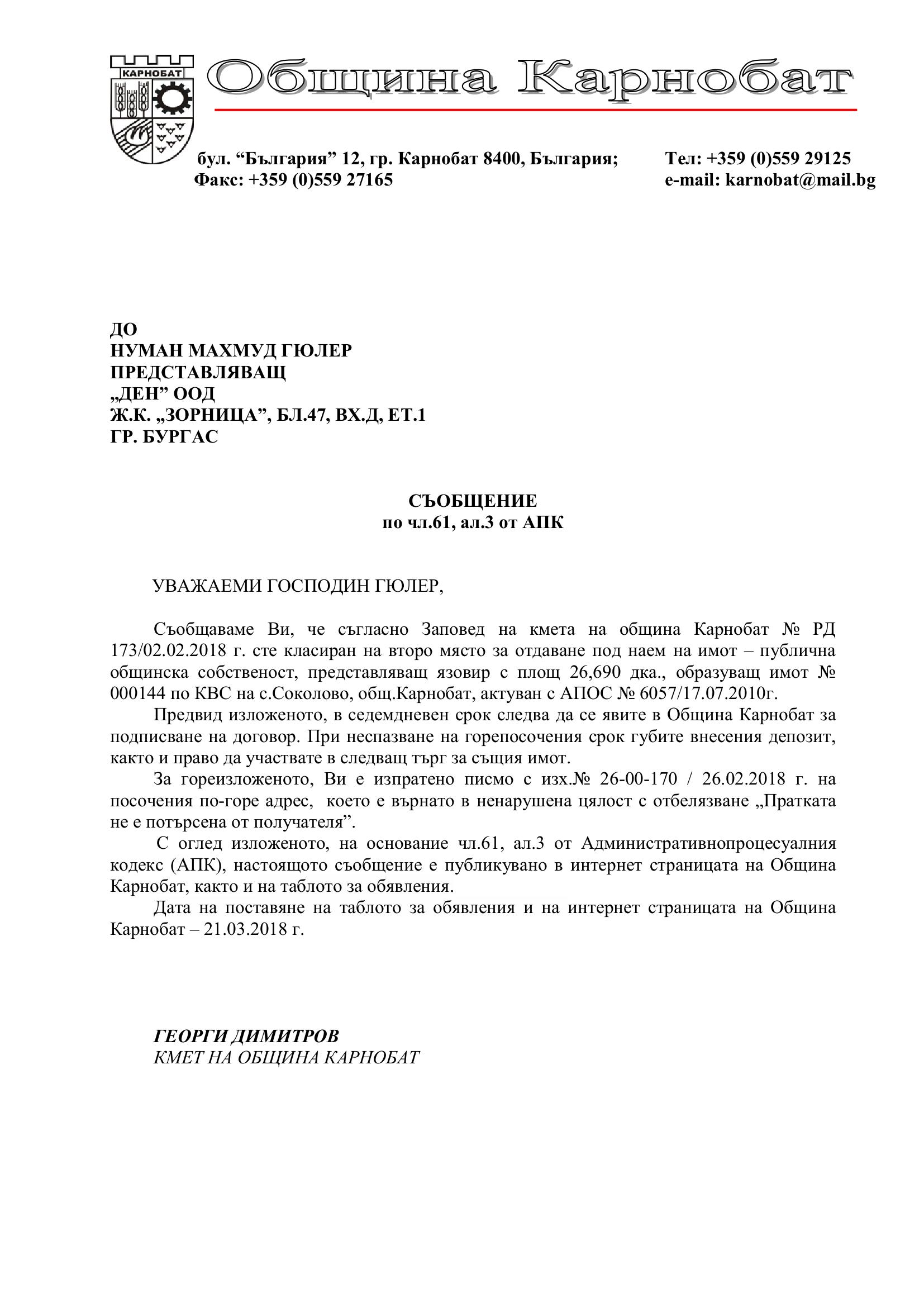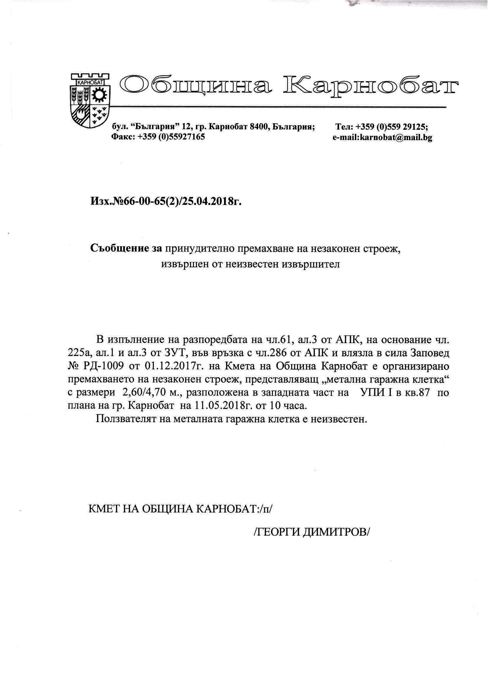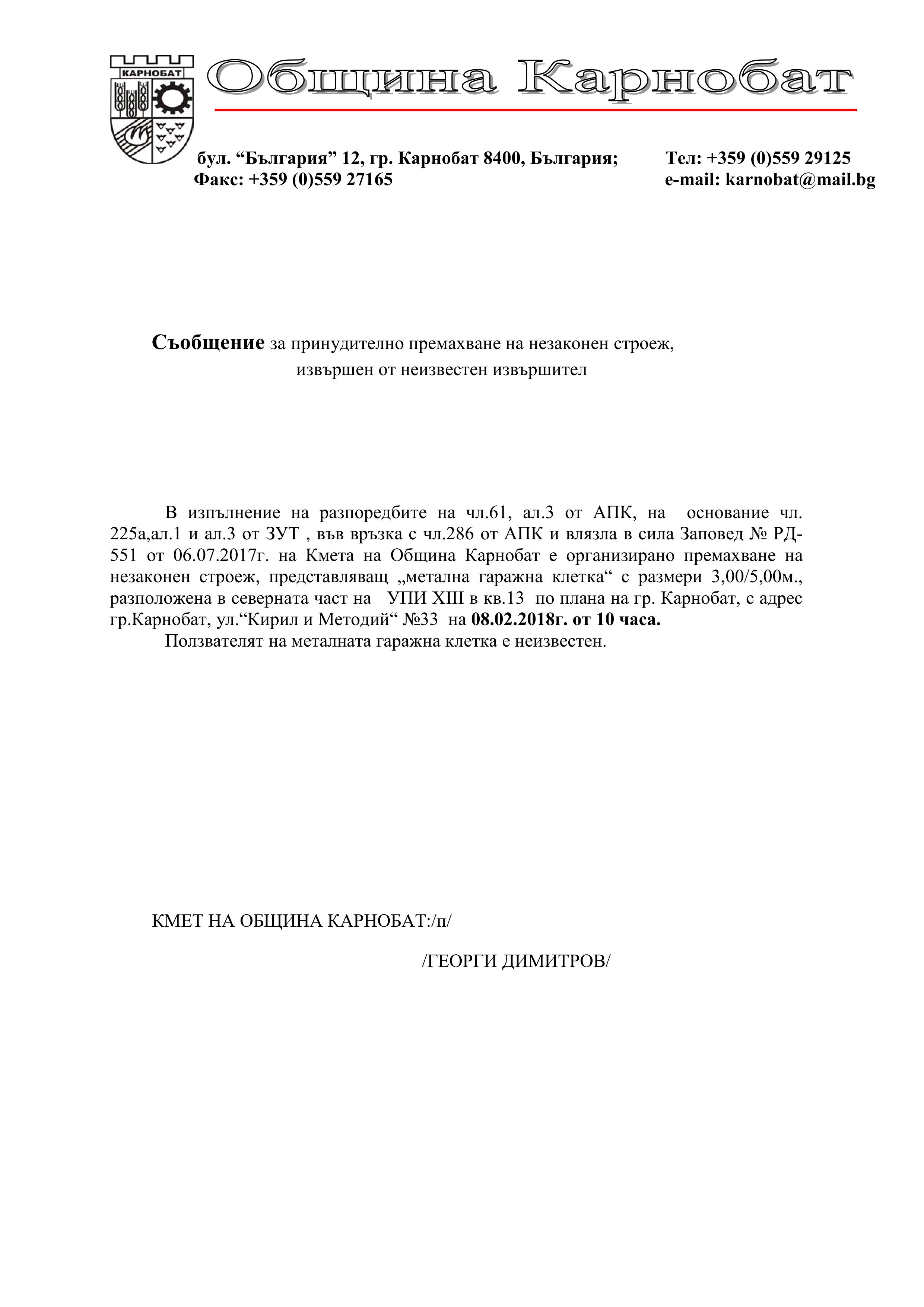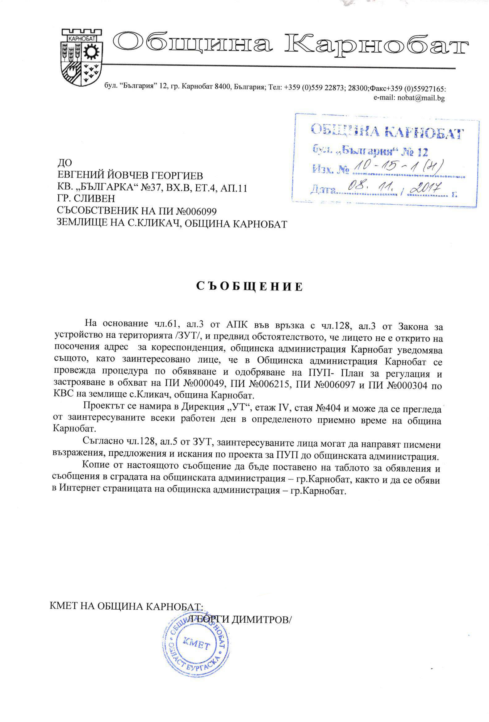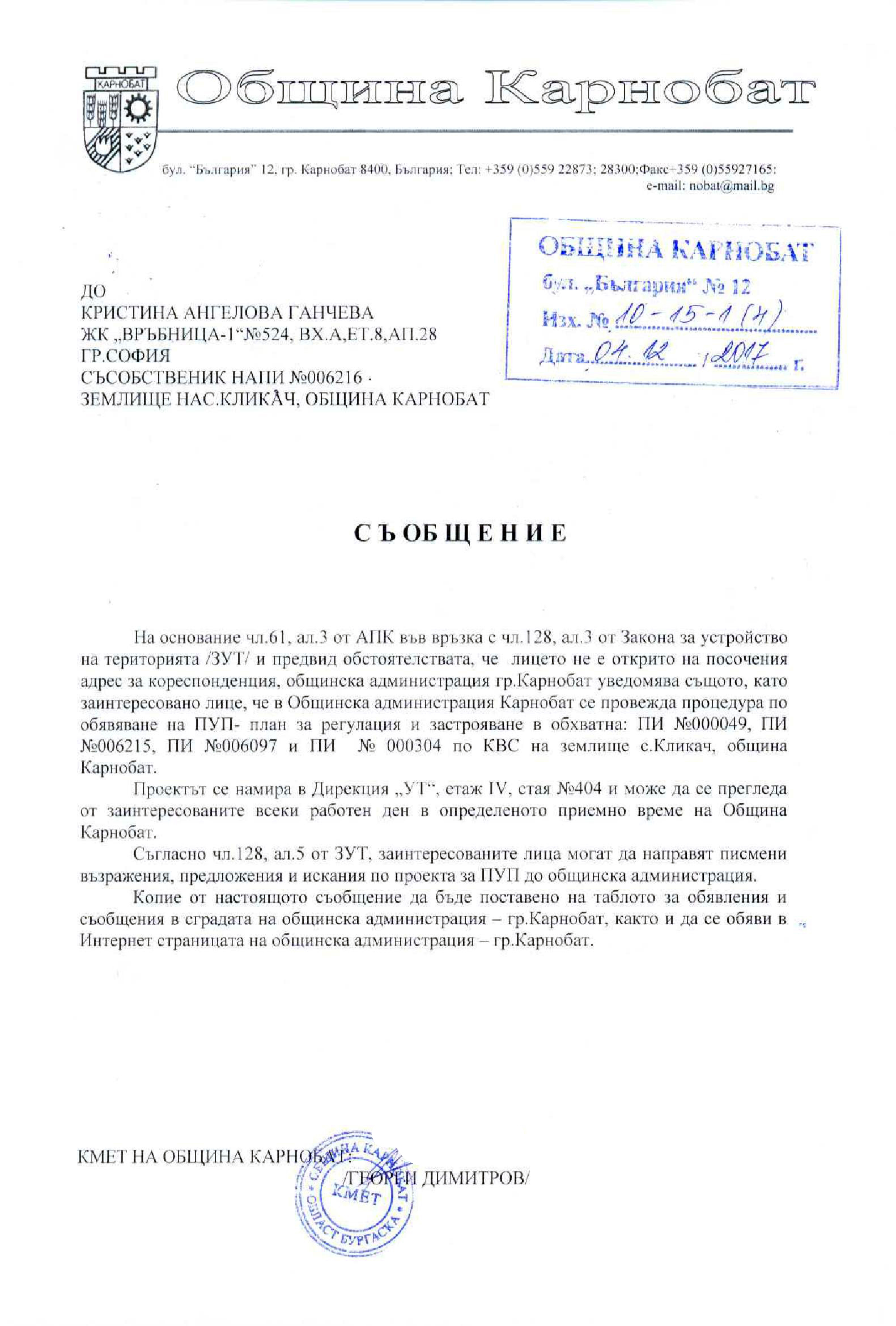 Обявление на основание чл.127, ал.6 от ЗУТ