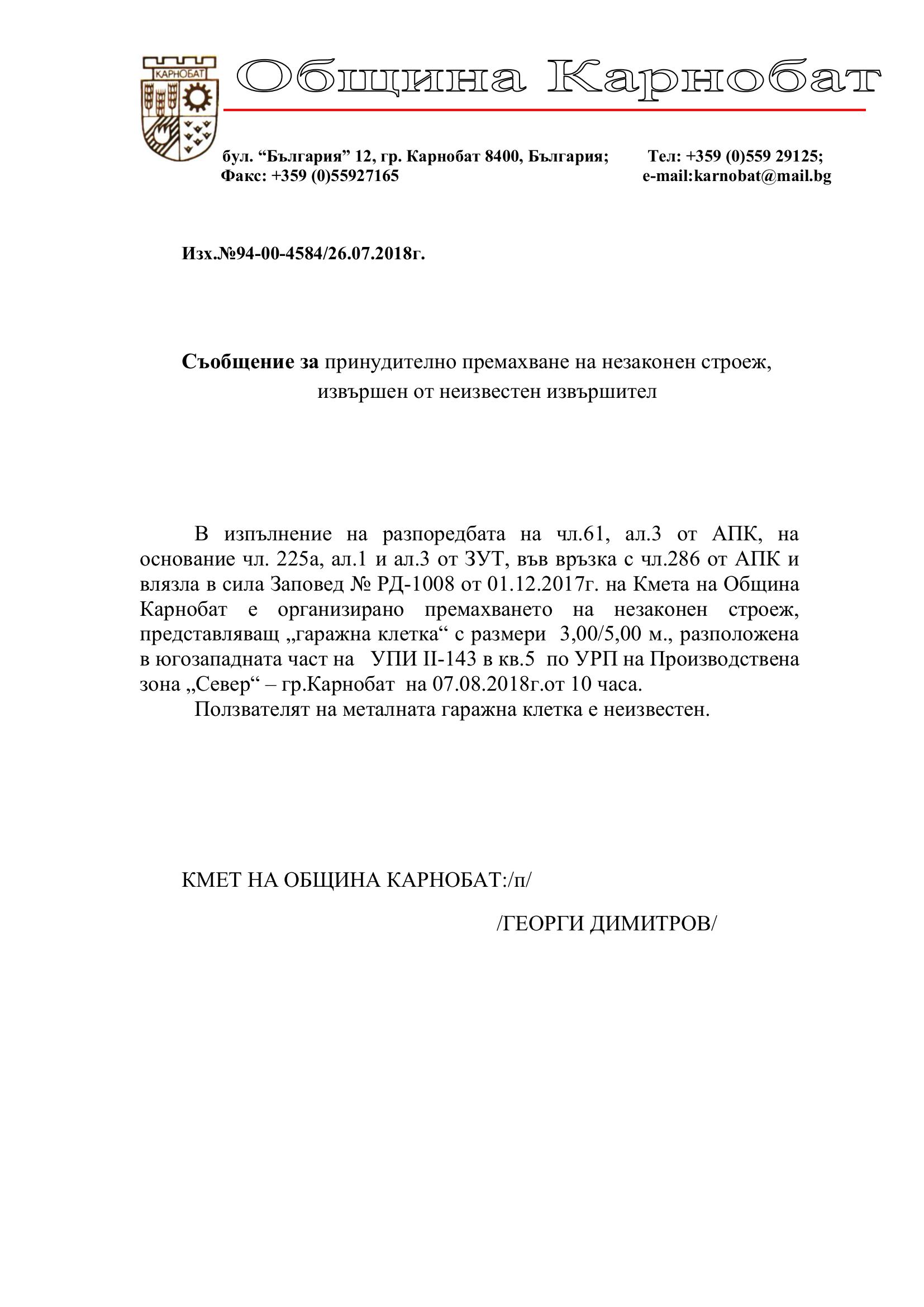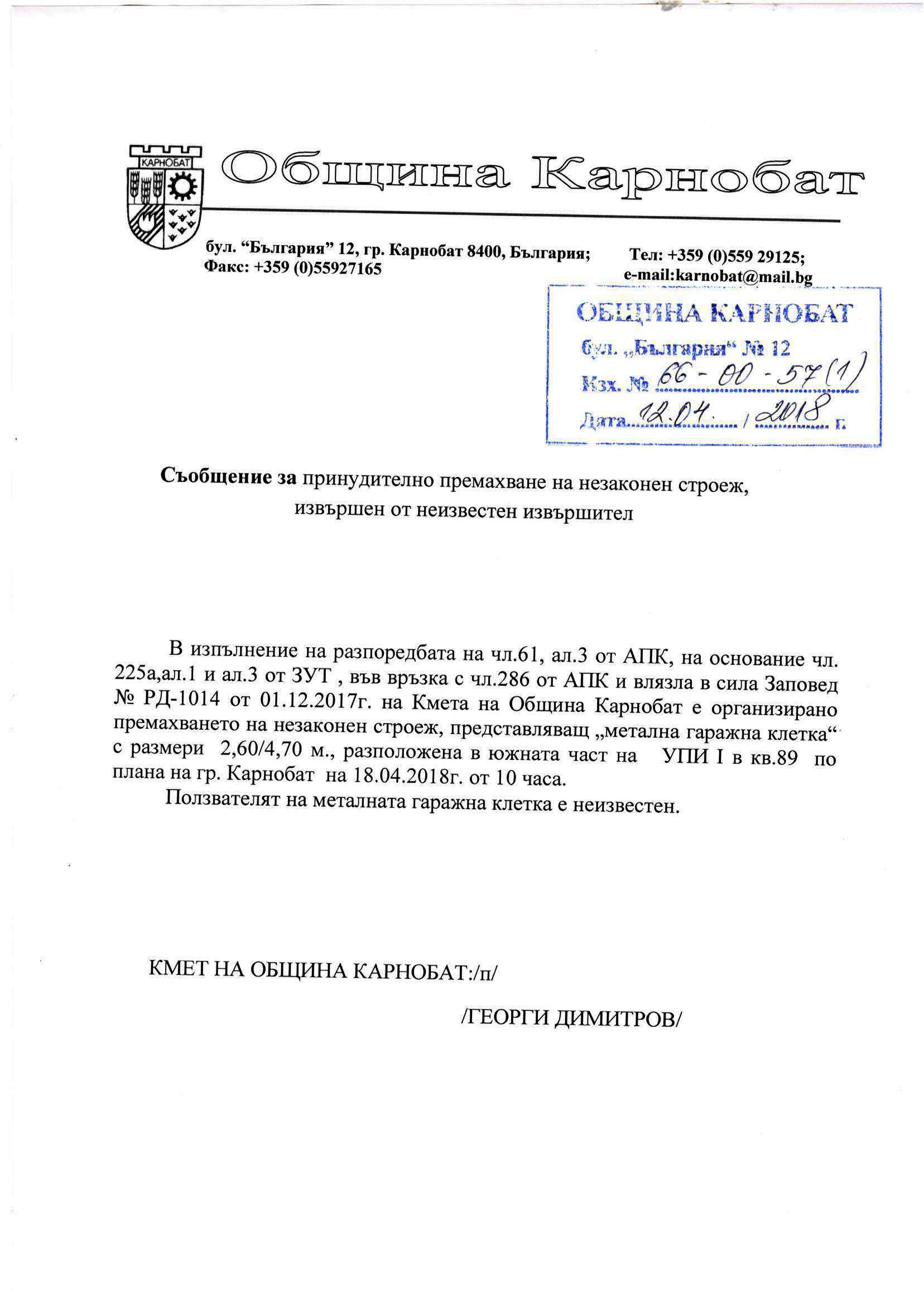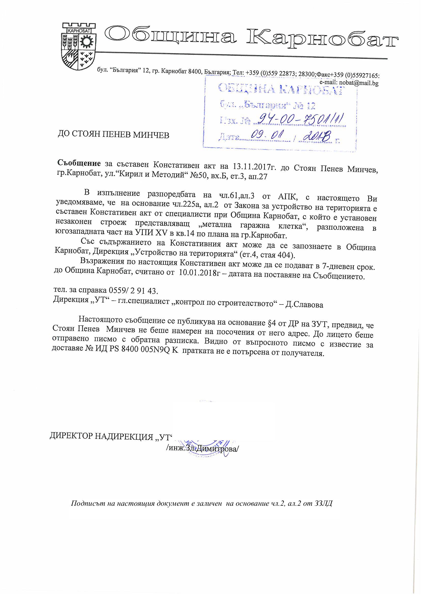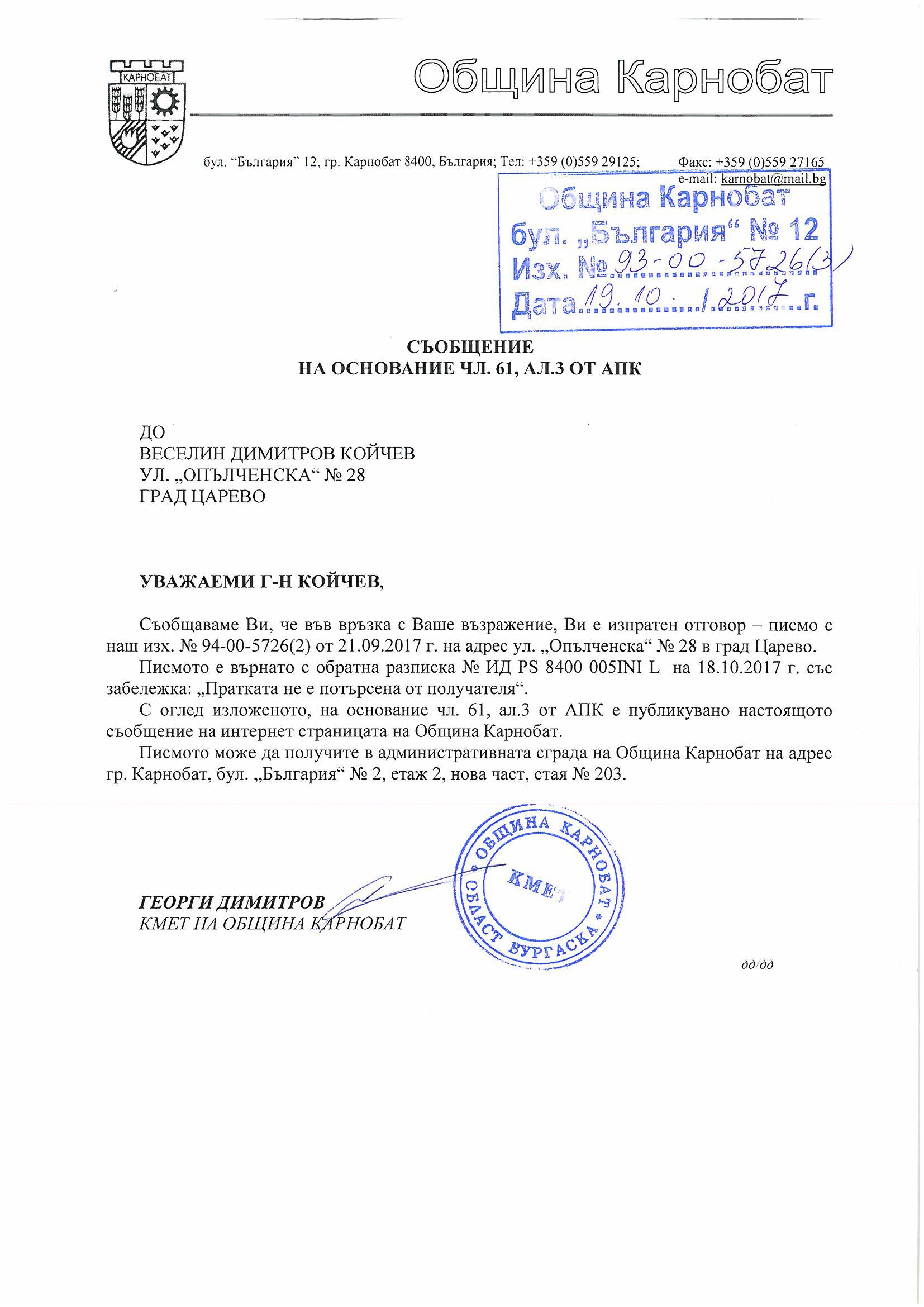Обявление на основание чл.127, ал.6 от ЗУТ