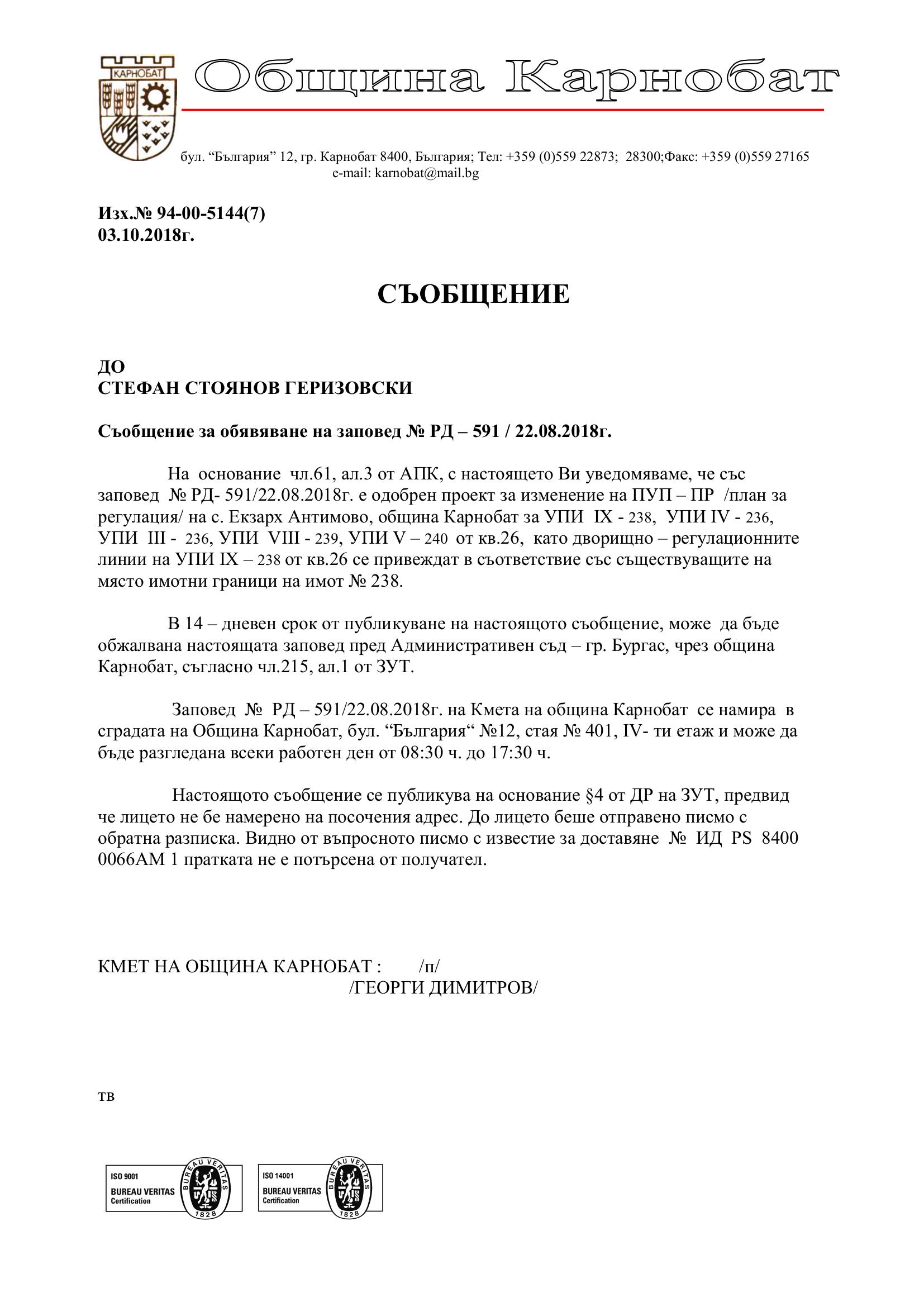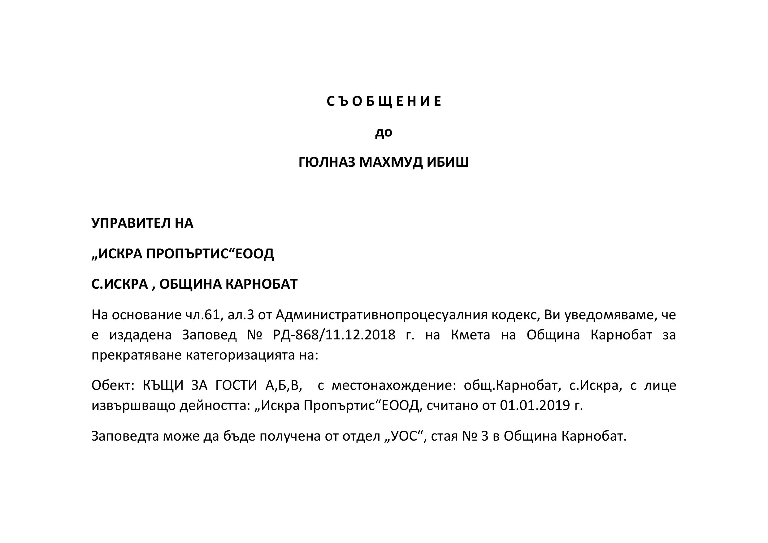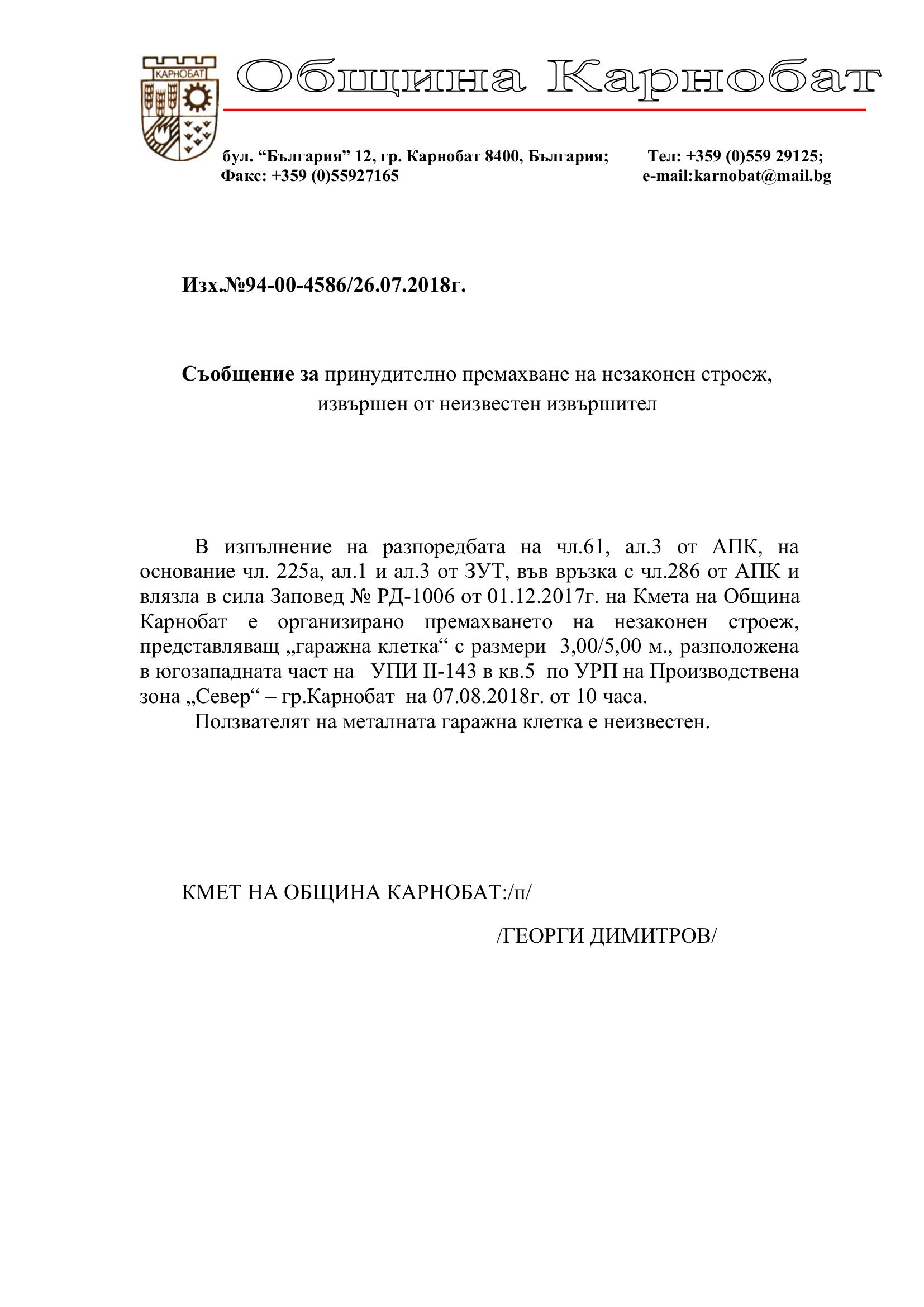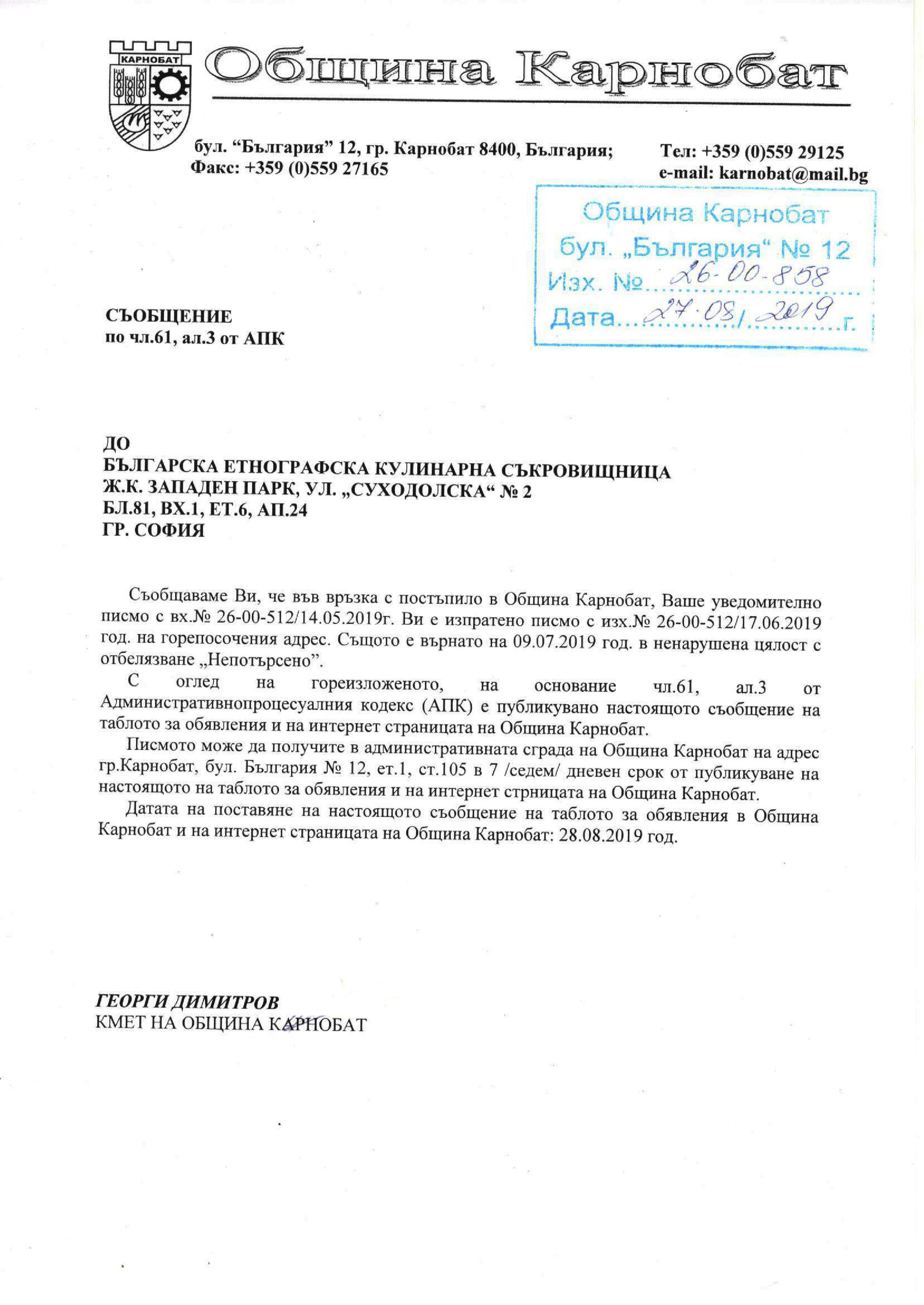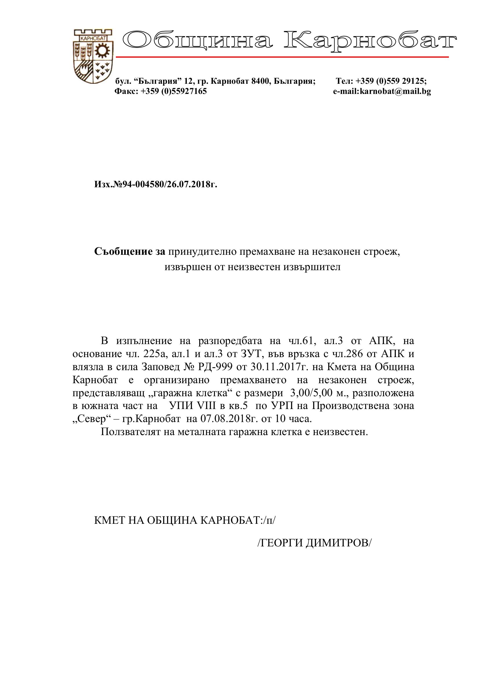 Обявление на основание чл.127, ал.6 от ЗУТ