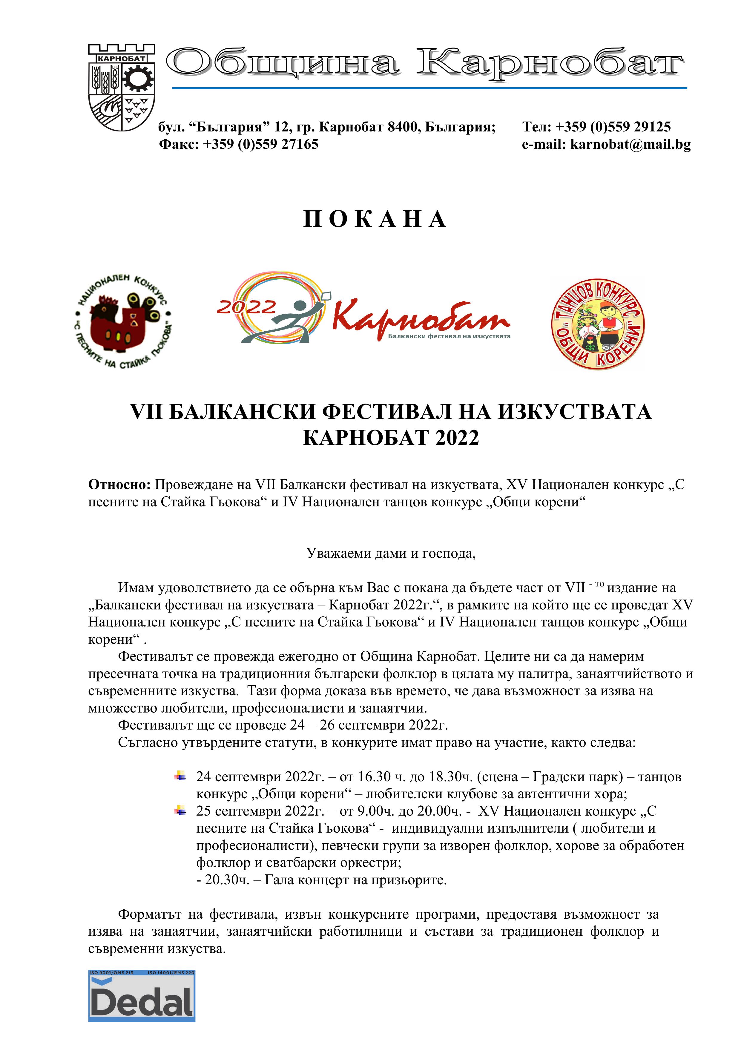 ПОКАНА ЗА УЧАСТИЕ В VІІ БАЛКАНСКИ ФЕСТИВАЛ НА ИЗКУСТВАТА КАРНОБАТ 2022