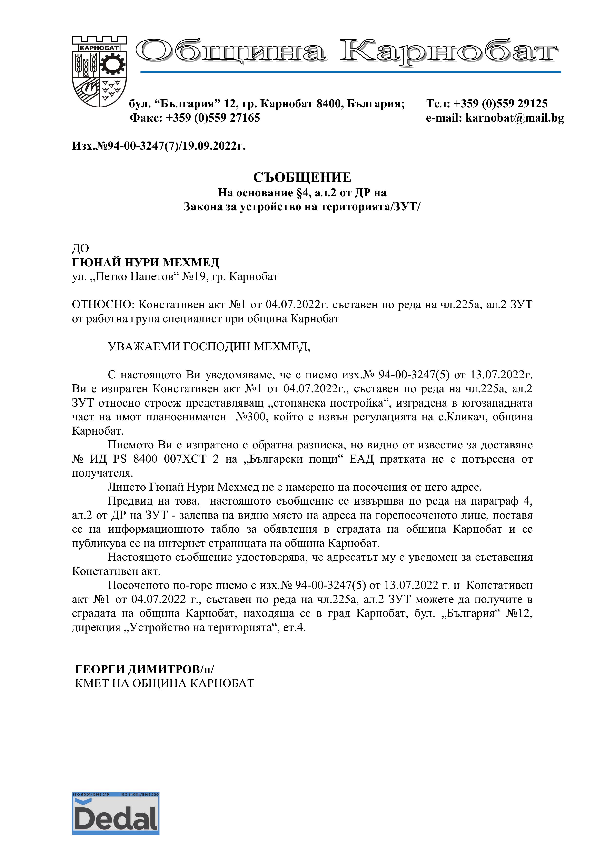 ОТНОСНО: Констативен акт №1 от 04.07.2022г. съставен по реда на чл.225а, ал.2 ЗУТ от работна група специалисти при община Карнобат