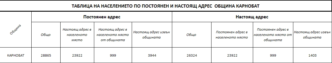 Kъм 15.03.2012 год. населението на община Карнобат е 28 865 души, от които 23 922 живеят в гр. Карнобат. При преброяването на населението проведено на 04.12.1992 год., постоянното население на община Карнобат е било 32 686, а в края на 1999 - 31 444. В периода от 1965 г. досега населението в общината постепенно намалява. Това се дължи главно на изселванията на населението и влошената възрастова структура в някои села на общината - с. Деветинци, с. Козаре, с. Добриново, с. Сан Стефано. В процеса на механично движение по-голямата част от мигриращото население се е насочвало към общинския център и малка част извън общината. Това поведение на демографската маса е довело до нарастване на гр. Карнобат, който абсорбира в себе си около 69% от общото население на общината.
